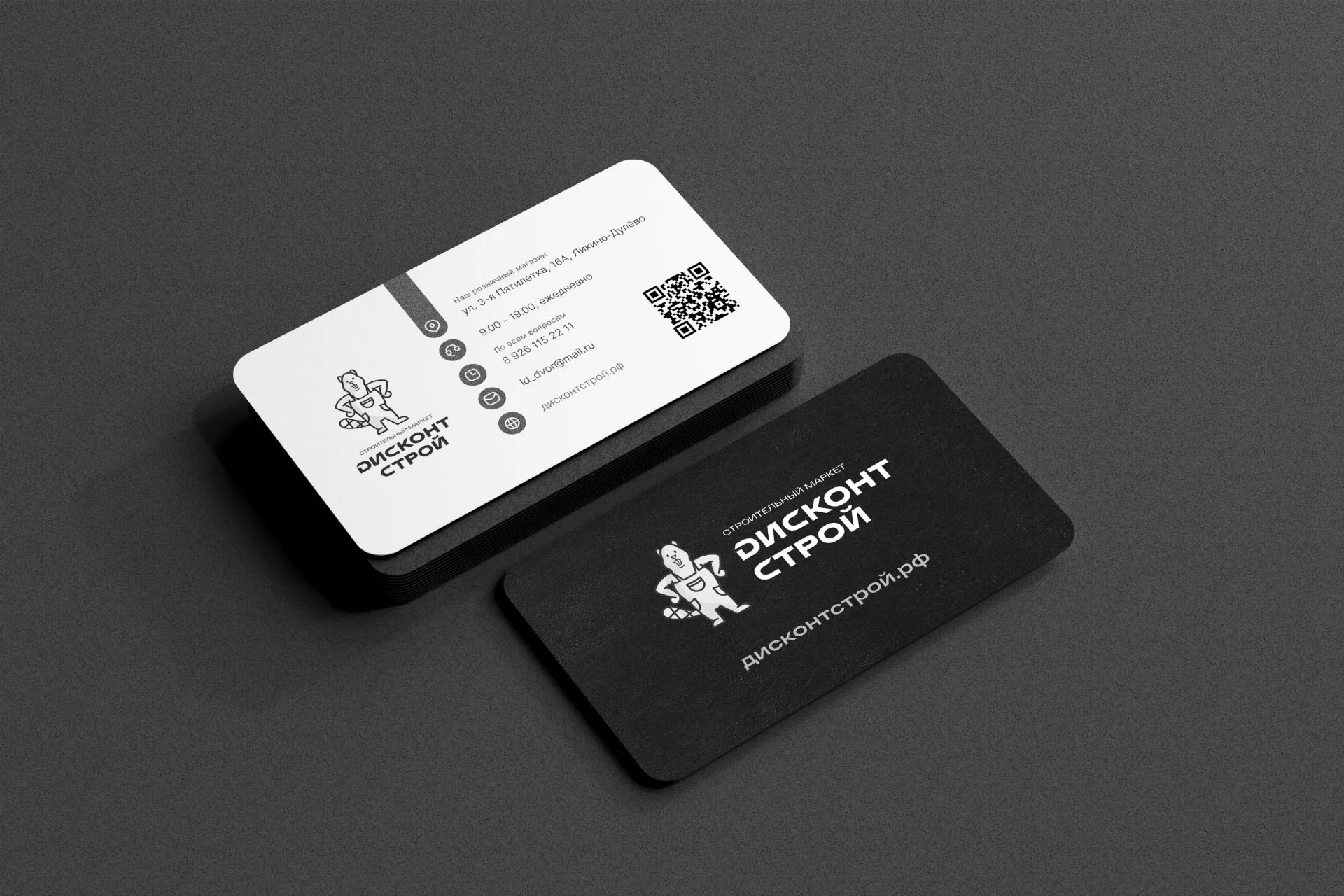 Вместе с логотипом, мы предложили заказчику сразу визуализацию логотипа в возможном дизайне на фирменный визитках магазина «Дисконт Строй» в Котовске.